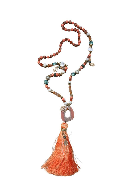 Μακρύ Κολιέ Vintage, με Πετρούλες και Κοχυλάκια σε Πορτοκαλί χρώμα