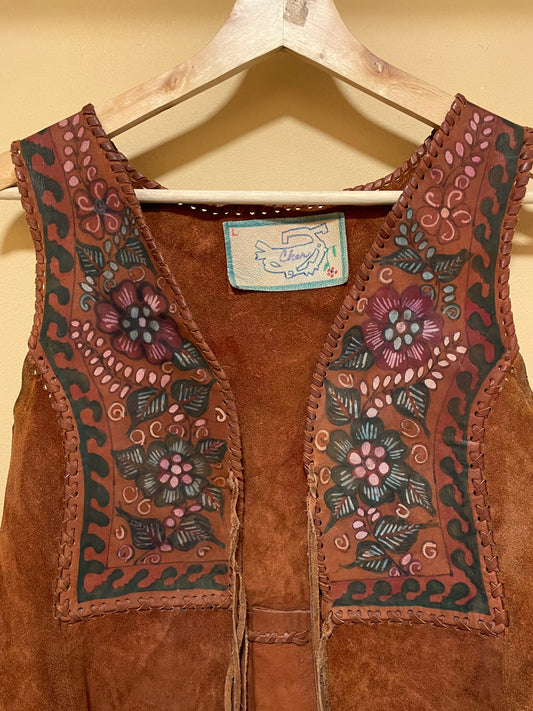 Vintage, Δερμάτινο, Μακρύ Γυναικείο Γιλέκο σε Καφέ χρώμα (Medium)
