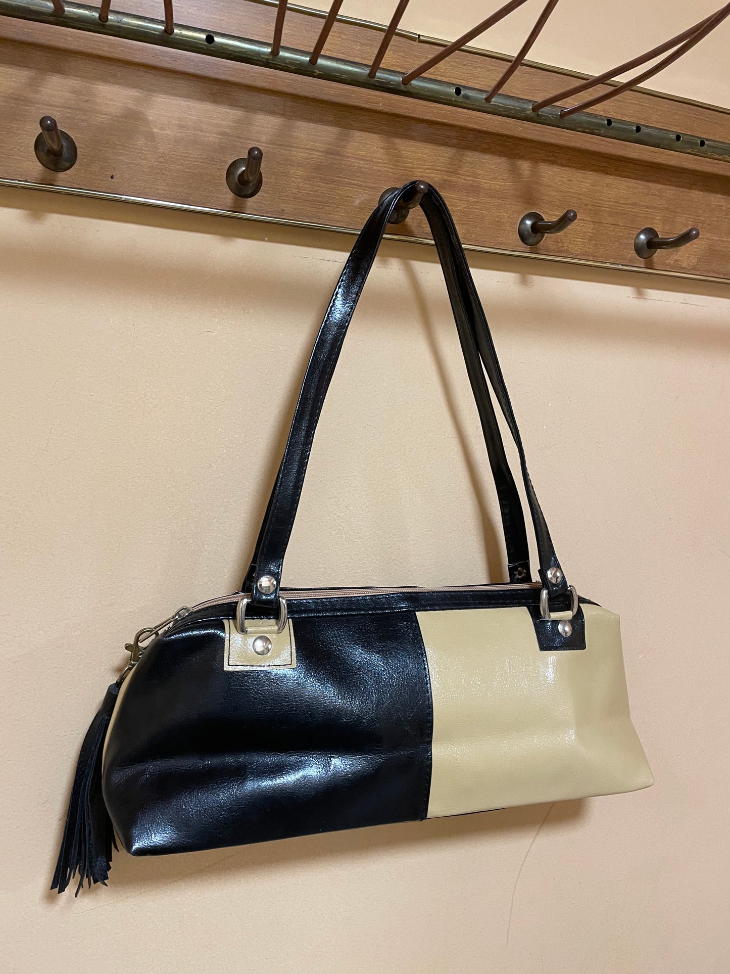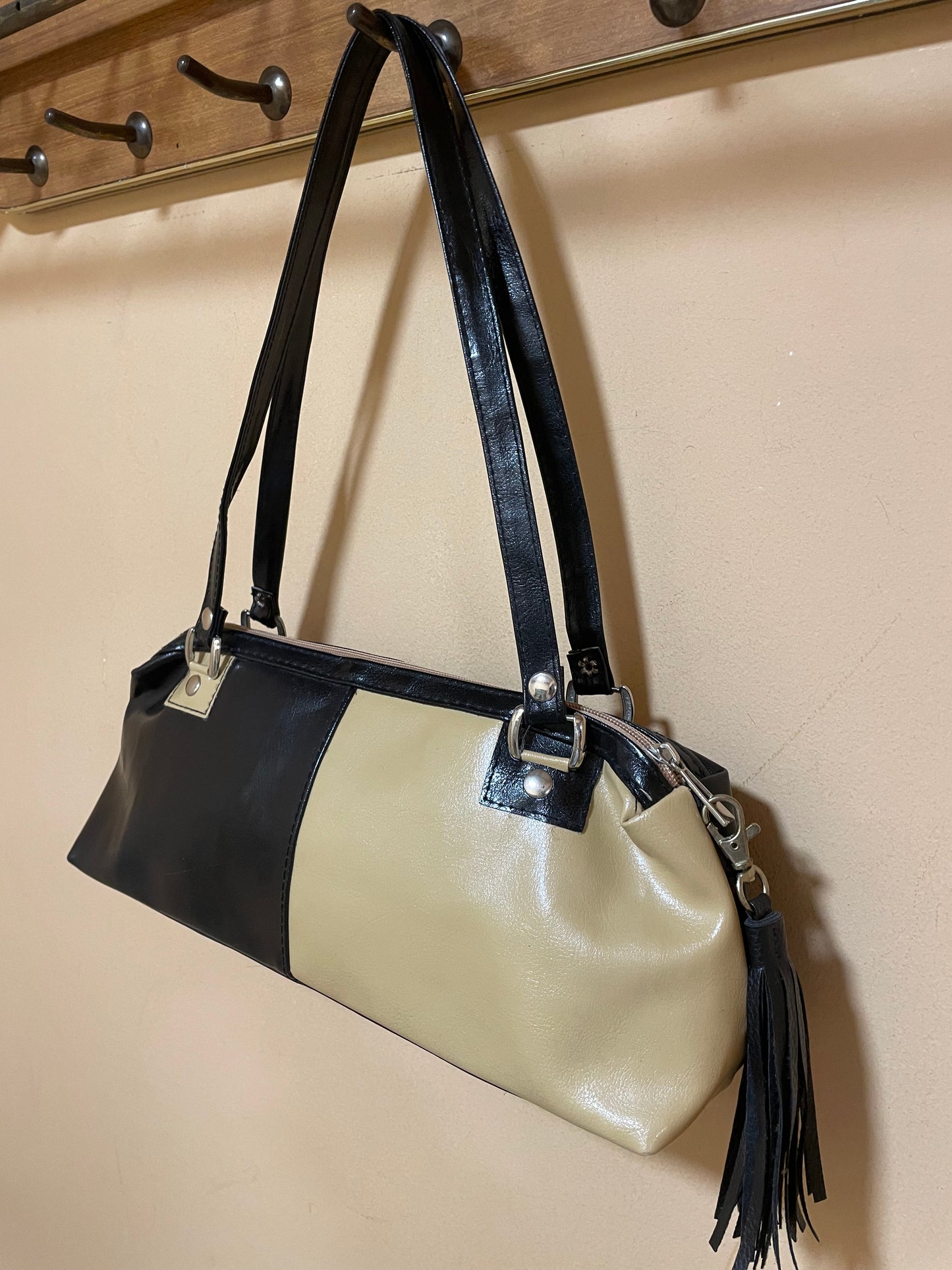 Δερμάτινη, Vintage Γυναικεία Τσάντα Ώμου σε Μαύρο-Μπεζ χρώμα.