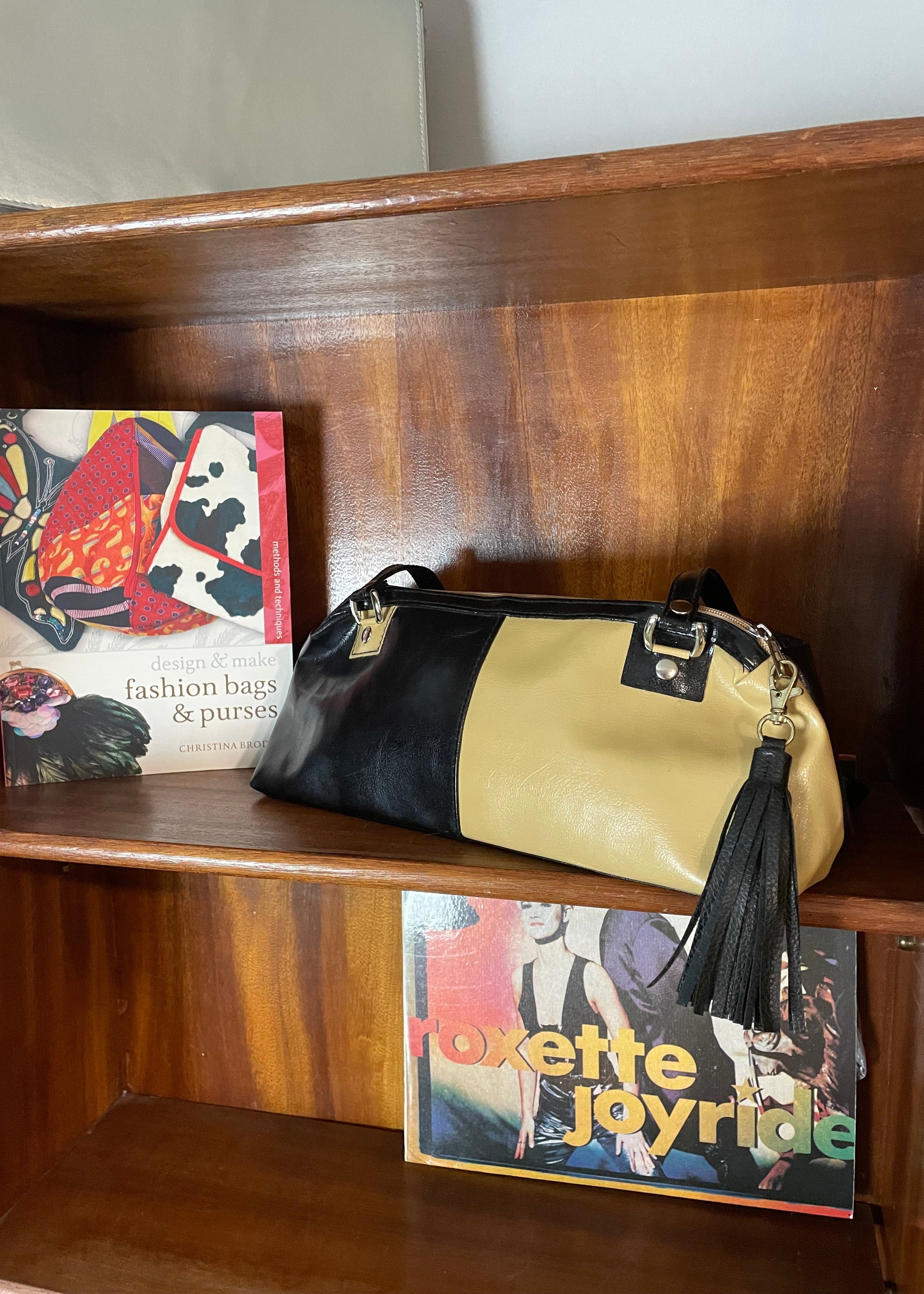 Δερμάτινη, Vintage Γυναικεία Τσάντα Ώμου σε Μαύρο-Μπεζ χρώμα