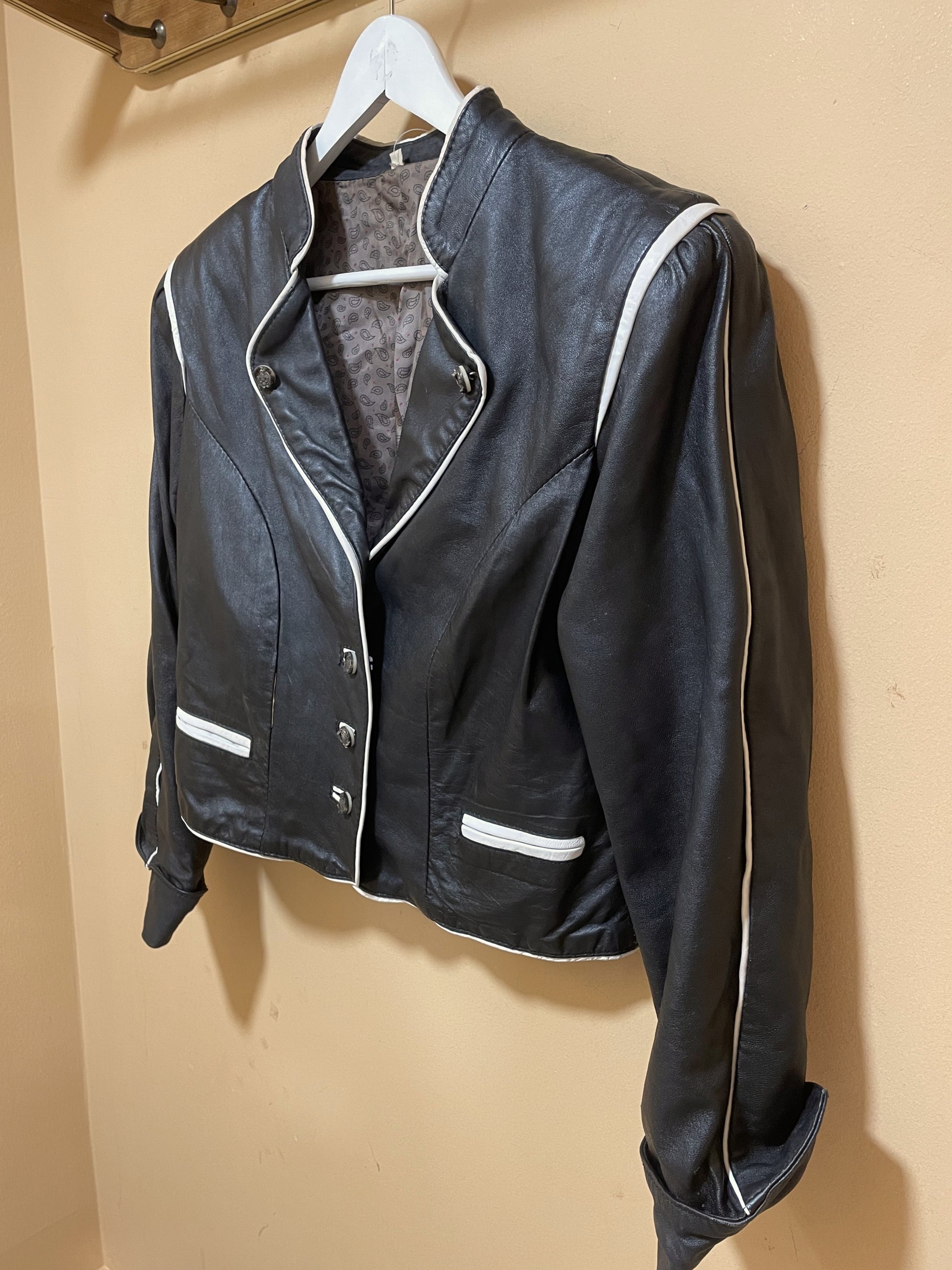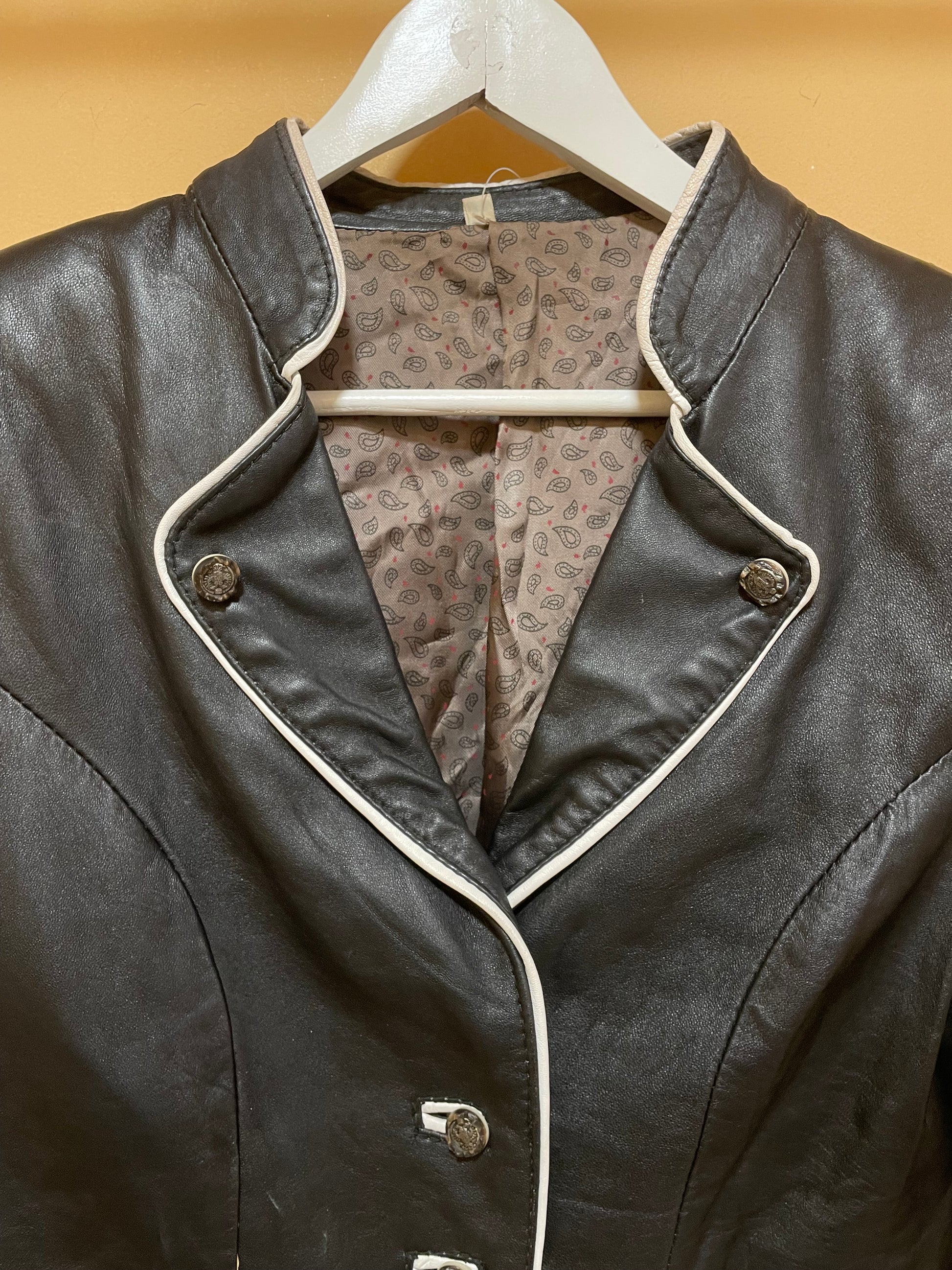 Μοναδικό κομμάτι, όχι σκληρό δέρμα, με ιδιαίτερα κουμπιά,στεπάκια και τονισμένους ώμους με βάτες.
